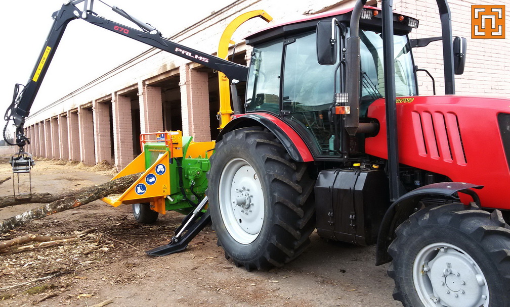 Комплекс рубильный передвижной МСА-700 ТУ BY 190369967.001-2015, (Республика Беларусь) Производитель УП "Техагрокомплект" (Республика Беларусь) (Комплекс состоит из: щепорубительной машины Heizohack, гидроманипулятора и трактора МТЗ «Беларус»).